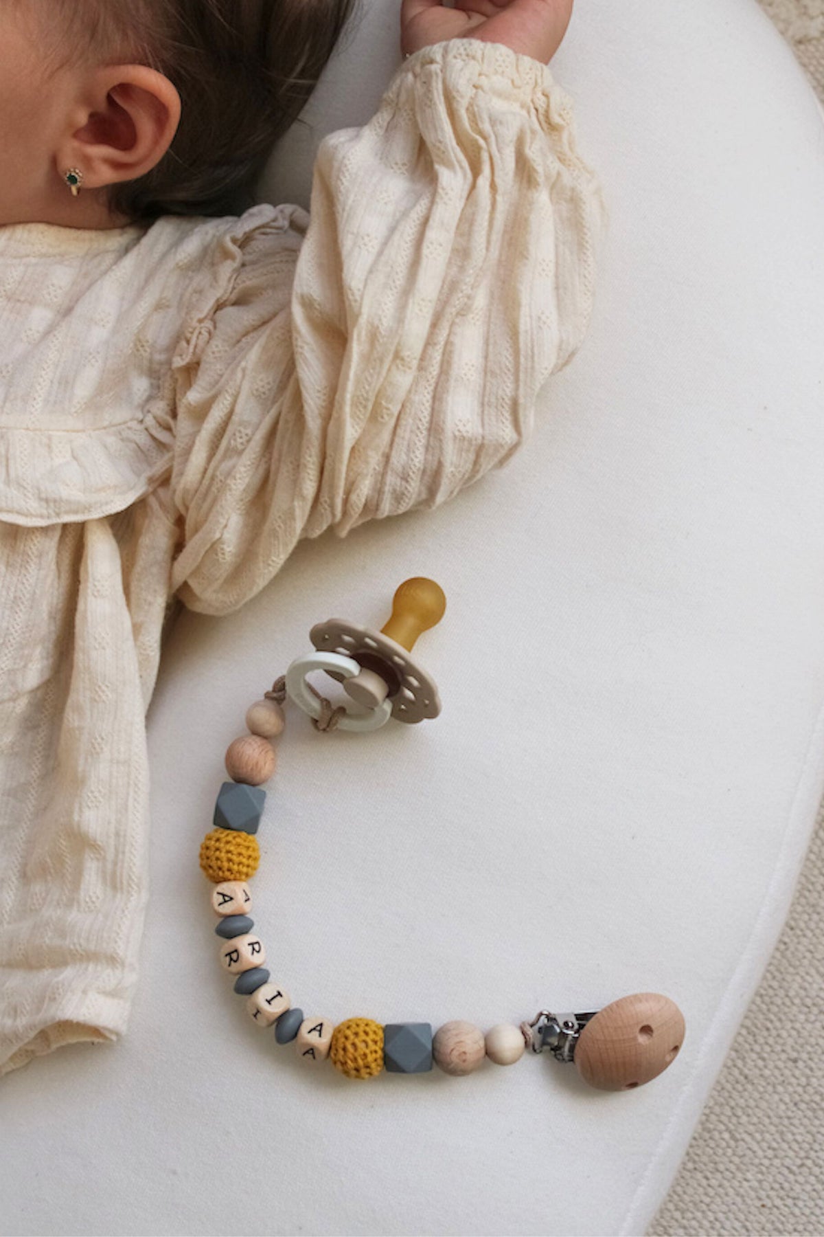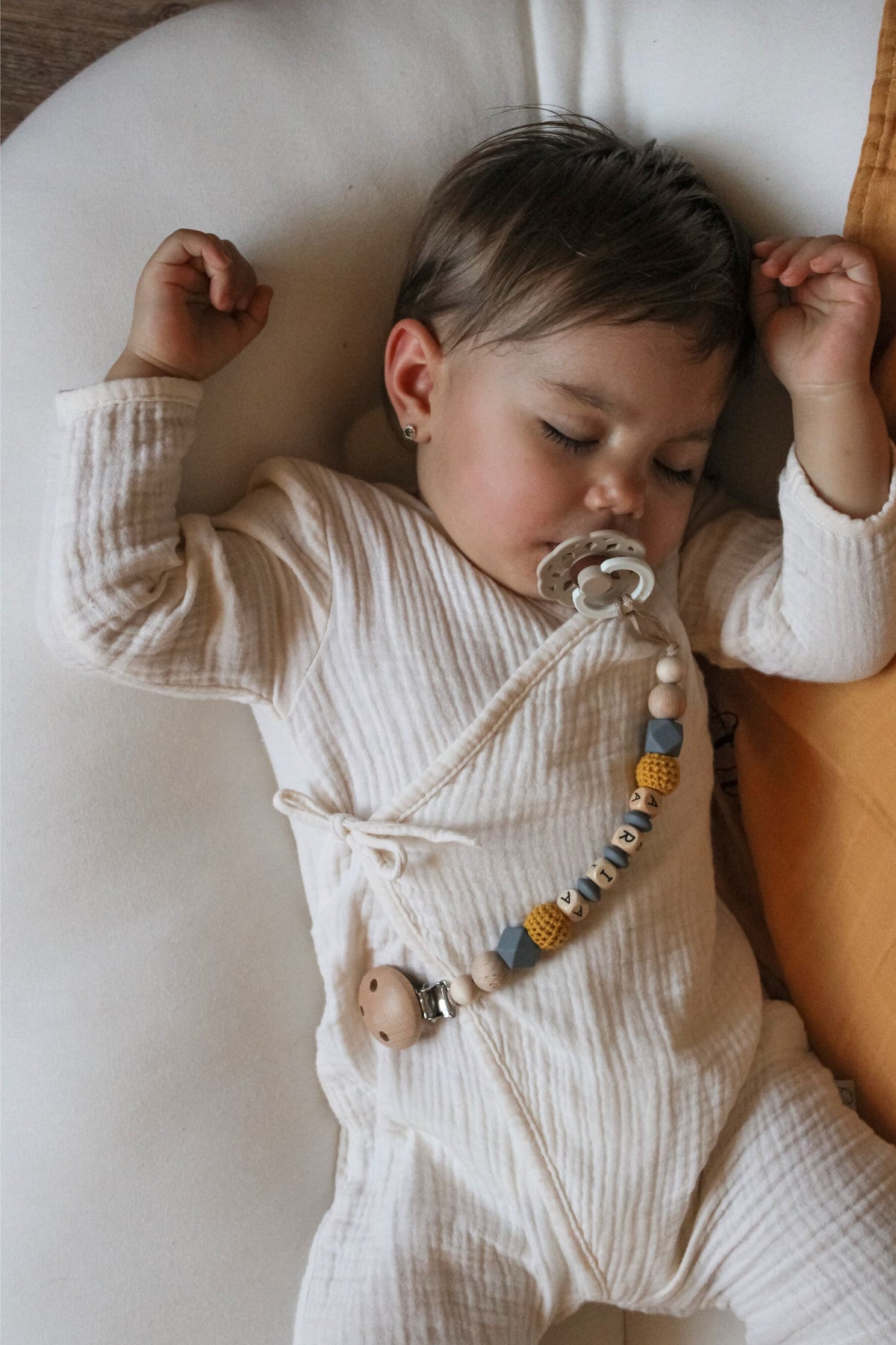 Die Schnullerkette senfgelb ist für alle geeignet die gerne etwas neutrales aber trotzdem farbenfrohes möchten. Die liebevoll hergestellte Schnullerkette sorgt dafür, dass der geliebte Schnuller nicht verloren geht. Sie ist ausserdem ein wunderschönes Accessoire und ein Erinnerungsstück.